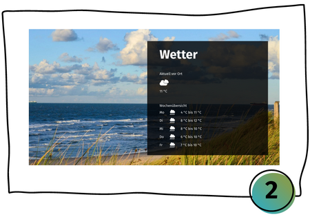 In all variants, individual weather icons for weather conditions, temperature and wind speed in km/h (or bft, ms) are displayed for up to 5 days. The data is updated once a day. In variant 0, times are also displayed. The number of days, the time interval (e.g. 08:00, 12:00 and 18:00) and the CityID of OpenWeatherMap can be maintained editorially - provided that the connected provider supplies the data.