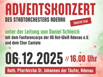 The City Orchestra Adenau will present its Advent concert this year on Saturday, December 6, 2025, at 4:00 PM in the parish church of St. John the Baptist in Adenau, conducted by Daniel Schleich. Everyone who wants to musically prepare for the Advent and Christmas days is warmly invited. The City Orchestra will be supported by the fanfare corps of KG Rot-Weiß Adenau e.V. and the choir Cantare, and looks forward to many listeners.