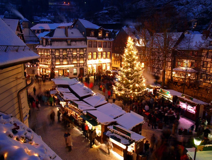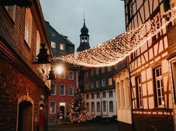 More than 60,000 LEDs illuminate the festively decorated old town like a starry sky. The enticing scent of gingerbread, almonds, and delicious mulled wine wafts through the narrow alleyways. 33 decorated wooden stalls spread from the marketplace through Austraße to "Paterehöffje" and over the Rur Bridge to Gerberplatz in Stadtstraße. Since 2019, the market has been organized without plastic. Mulled wine and punch are served in the "Monschau Christmas Market mugs."