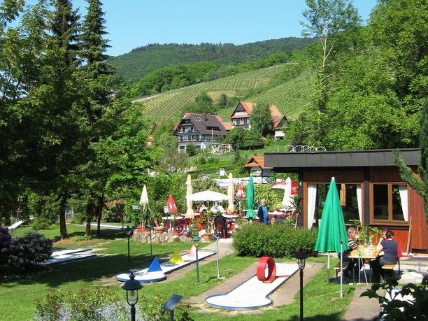 In summer on our idyllic terrace, in the green with a marvellous view and the sound of the stream and in the transitional months sheltered in our winter garden. Welcome to the HöfnerStübl Minigolf