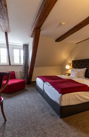 From our historic courtyard terrace, you can enjoy an unobstructed view of the castle and collegiate church. Directly opposite you can experience garden dreams in the Abteigarten and Brühlpark. Or you can simply let yourself be touched by the flair of the historic half-timbered town, which borders directly on the hotel property.