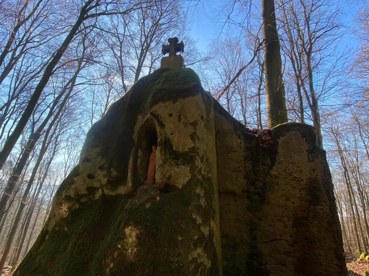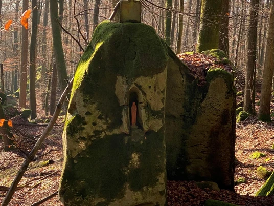 This rock has the shape of a chapel and in its center there is a natural niche, where a statue of the Virgin Mary has been placed. A cross was once erected on the rock. It is assumed that workers who have been quarrying sandstone in the Bollendorfer Forest for centuries regularly visited this small image to pray out of gratitude for returning home safely to their families after a day’s work.