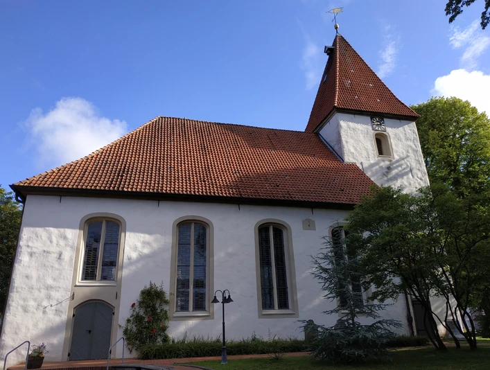 The village of Hambergen and the villages of Wallhöfen, Vollersode, Heißenbüttel and the single farms of Giehlermühlen and Bullwinkel, which later became part of the parish, initially belonged to Scharmbeck for ecclesiastical purposes, but due to the long distances, the farmers of the above-mentioned villages decided in 1335 to build a small church from their own resources. A contract dated December 13, 1335, confirmed by Bishop Borchard of Bremen and Provost Otto between the parish priest in Scharmbeck and the farming communities of the above-mentioned villages and the farms Giehlermühlen and Bullwinkel, documents the permission to hold church services in Hambergen. The chapel is dedicated to the doctors Cosmas and Damian, twin brothers who died as martyrs during the persecution of Christians by the Roman Emperor Diocletian. On June 10, 1753, the new church building, which still stands today, was consecrated. Major renovation work was carried out inside the church in 1964 and 1998.