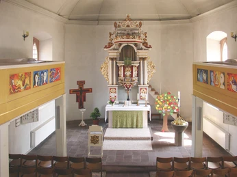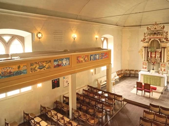 In the interior of the church, the Lamspring artist Micha Kloth created a cycle of 12 colorful pastel paintings for the gallery balustrade between 2005 and 2007.Good to know