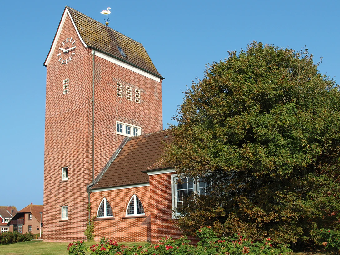 When the number of bathers on the island increased after the First World War, the capacity of the old church with its 50 seats was exceeded, so the large island church was built between 1929 and 1930, initially without side aisles, which were added in 1959. In 1964/65, the tower was raised and two smaller bells were added to the existing large bell. These two bronze bells come from the Glockengießerei Otto from Bremen-Hemelingen. They were cast in 1965 and have the following chimes: des'' and es'' and weigh 240 kg and 170 kg.[2][3] Today the building has room for 300 people and is the parish's main church.