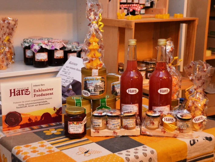 With a great deal of idealism, beekeeper Henning Illers and his wife have set up their small store under the motto "If the bee dies, the man dies". They offer various types of honey from Wieda and the surrounding villages as well as beeswax candles made from their own beeswax. They also sell excellent grape juice and St. John's jam, the fruits of which are harvested in their own garden. For further illustration, an educational bee trail has been set up in cooperation with the Harzklub. This can be explored individually or as part of a guided tour with the beekeeper.