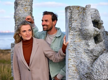 The viewer approaching the sculpture made of stone and bronze perceives it as a large sculptural head. On one side, the head bears an abstract stone "material form". On the second side, the first side is transformed into a "man in the ear". The sculpture is located on the beach at Burhave - near the Regenbogen Ferienanlagen Fedderwardersiel.