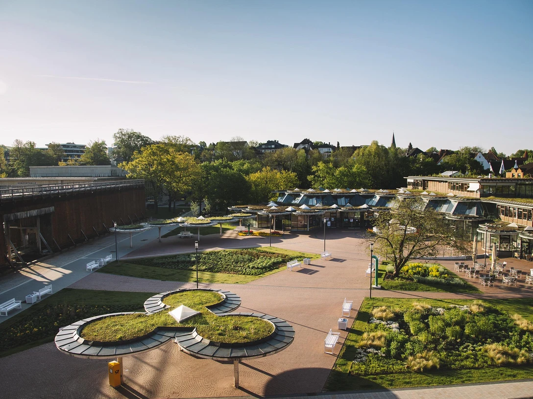 At the southern edge of the spa park, the Kurgastzentrum was built between 1981 and 1983, a multifunctional building with a spacious, garden-architecturally designed green area by architect Günter Behnisch, known for the construction of the Olympic site in Munich.