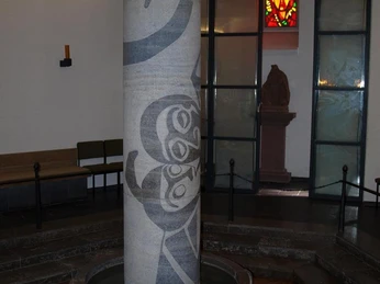 It is called the Tree of Life Church because a tree of life in the form of a column grows from the baptismal font, which is located in the crypt. The column was designed by the Cologne artist Toni Zens. The tree of life pierces the ceiling and grows into the choir room of the church. A special feature of the church is the altar table, which provides an unobstructed view of the tabernacle. The altar slab was decorated with fruits and leaf patterns.