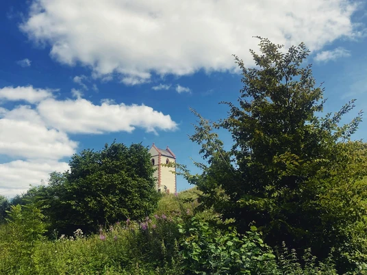Until 1876, the small late Gothic church of St. Lucia, with its characteristic tower, stood on the small hill at the eastern edge of Ferschweiler. Almost 50 years earlier, the village had received a new, larger church not far away, which is still the parish church today. From the old nave, only masonry remains today, but the tower with its characteristic stepped gable has survived and is a notable monument. The small village church was intricately built in the late Gothic style, with a vaulted ceiling and windows featuring beautiful tracery. Its floor plan is well recognizable, and individual elements of the architecture and furnishings can still be seen. A window lintel bears the date 1534; however, the stepped gable of the tower was only created in the 18th century.