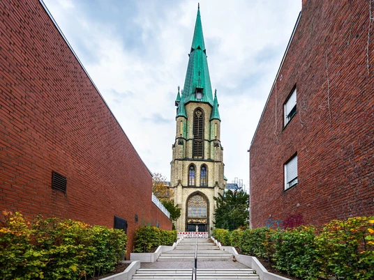 The parish church in Altenberge probably dates back to a foundation by Liudger. During excavations in 1970, the apse of a Romanesque predecessor building with a west tower was discovered. The present church dates back to the 14th century and was built as a three-bay hall church with a polygonal choir. The sacristy bears the date 1590. In 1882, Hilger Hertel the Elder erected the neo-Gothic west building with tower. The cross gables of the side aisles were probably rebuilt in 1882. The centre bay with sandstone portal was renewed in 1961. Inside, ribbed vaults on round pillars with services. The keystones from the 14th century are coloured and decorated with figures. The neo-Gothic western section has star vaults. There are sacrament, wash and choir niches in the choir. The 15th century tendril painting was uncovered in 1963. The coloured choir window by Victor von der Forst dates back to 1890. In front of the south portal is the larger-than-life sculpture of John the Baptist by Hans Dinnendahl from 1983.