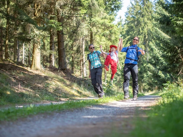 The Ginsberger Heide has always been a popular destination for families. The circular route, child-friendly 4 km, leads past all the sights. From the start, it is only a few meters to the Gillerberg Tower, which rises unmistakably 15 m high and guarantees a great view. After 1.5 km, big and small hikers reach downhill Hilchenbach's landmark, the Ginsburg. The legend of the robber knight Hans Hübner will especially enthuse the youngest, and the view over the entire Siegerland rewards the whole family. After refreshing yourself in the Ginsburgstube, you continue on rustic forest paths to the next stage destination: the natural playground Ginsberger Heide. Here, children can explore and get to know nature in a playful way. There is also space for a picnic in the open nature, or you can take a break at the Hotel+Restaurant Ginsberger Heide before on the last part of the hike—past the ski lift—going uphill again to the starting place.Â