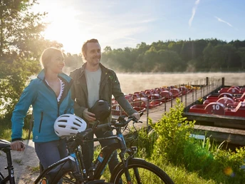 The 3-Lake route starts in an idyllic setting at the Kurpark pond in Weiskirchen. From here, it goes along the Holzbach past the Marien Grotto towards Konfeld. Through an open meadow landscape, the route passes a favorite spot of Saarschleifenland, the chapel of Marian devotion in the Friedwald between Wadern and Weiskirchen. Through a forest section, you reach the recreational center around Noswendel Lake. Although Noswendel Lake is not a bathing lake, there are many opportunities to linger around the lake. A round with the pedal boat is a welcome change on the bike ride. Also inviting is the catering organized by the local heritage and tourism association at the lake – especially on Sundays when the large cake buffet is laid out.