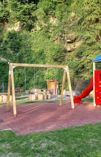 Over approximately 500 meters, various attractions make children's hearts beat faster. They eagerly try the rope climb with slide, let little balls roll down the "Chogalibahn," get to know trees, bushes, and animals, or walk barefoot over moss, stones, and fir cones. They stand amazed in front of Chrüterhäxli Lilli Gwonder's witch house with herb garden. Along the way, short steps lead into the stream bed where children, especially in summer, can splash heartily. Soon hunger sets in! Children love making fires and roasting a Cervelat on a stick. The two grill stations offer plenty of opportunities to grill to your heart's content.