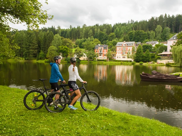 The starting point of the route is the free parking lot "NaturTheater" at the entrance to Bad Elster. From there, follow the Saxon Central Uplands long-distance cycle path towards the town center, past the NaturTheater and the bathing and sauna area in Albert Bad. Continuing along Badstraße, you will pass the spa park and Paul-Schindel-Park and cycle through the district of Reuth before the Saxon Central Uplands long-distance cycle path is left in the district of Sohl.