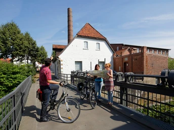 Red is also the signal color for cyclists to stop – especially at the Cloth Maker Museum Bramsche. Here you experience historical machines in action. And you see how wool fabrics were produced here until 1972 that were sought after worldwide. Especially those in the shade of Bramscher Red, which clothed Hanoverian and English soldiers. It is obtained from madder plants grown in the dye garden of the industrial monument.