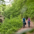 The route begins at Saargarten in Beckingen. This park, located directly on the river, is part of the international project "Gardens without Borders" and is especially worth a visit for families due to its playground equipment and the adjacent footgolf course. From Beckingen, the route continues into the Haustadt valley with its wooded heights. At Hargarten, the path ascends the Merchingen muschelkalk plateau and then leads over hills and valleys to Losheim with its namesake reservoir. Numerous recreational opportunities by the water as well as the lake garden with bistro and mini-golf course invite a longer break here. A detour into the village allows a visit to the railway museum. Further on, the e-bike route passes through a longer forest section and reaches the Saar valley again at Mettlach. Here, the ride can be interrupted to visit the ceramic experience worlds and the factory outlet of Villeroy & Boch. Also worth seeing are the Holy Lutwinus' burial church and the Old Abbey with its old tower and park. The Mettlach Abbey Brewery invites you to stop for a drink. Excursion boats are ready for tours on the Saar riverbank.