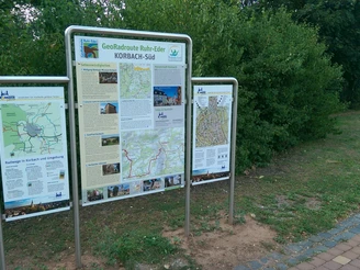 The entrance to the Ederseebahn cycle path is on the southern outskirts of Korbach. Here there are good parking and rest facilities (also for motor homes), a repair station as well as information boards with information about the city of Korbach and the bike paths around the city. A restored historic locomotive and old signaling equipment are reminders of the old railroad line.
