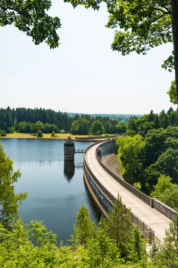 The glittering of the smooth surface of the water of the Dreilägerbachtalsperre dam shows you the next section of the trail. At a viewing platform, you can take a break above the lake. Of the four elements that define the Eifel, water clearly feels particularly at home here.