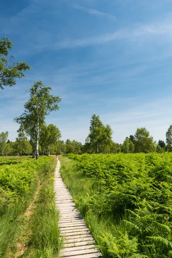A joyful start to your day: Today you are at the start of the first Eifelsteig stage! Take in the romantic atmosphere of the historical Korneliusmarkt in Kornelimünster: The market place and its buildings seem to be from another time; everything happens a little more slowly here and give a feeling of security. Enjoy an aromatic coffee at one of the charming cafés and then set off again on your hike. Right at the very beginning, you pass the stone Itertal viaduct, which used to be a railway bridge. Now, the Vennbahn-Radweg (Vennbahn Cycle Trail) runs along it. You conquer the steps on the first Eifel hill euphorically and slowly settle into your own rhythm on the narrow hiking trail. Soon you are breathing the fresh forest air and following the trail gently uphill to the clearing. Before you lies the mystical and idyllic Struffelt Heide upland moor. You may not realise it is there at first glance, but the moor is an enormous water reservoir. Narrow boardwalks show you the safe route through the nature conservation area. Your gaze floats over the calming landscape of grasses, birches and moors, allowing your thoughts to run free.