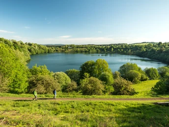 Today, your hike starts out gently along the first few metres through the Kurpark in Daun. But you soon realise that the landscape here must have had a fiery past. There is a particular atmosphere here, mystical and powerful. Step by step, you hike up to the first elevation and see something glittering between the trees. It is Gemündener Maar - a volcanic lake. You just know something dramatic must have happened here! Mighty explosions and fire from the earth’s interior blew holes in the earth and piled up mountains here in the Eifel. The holes are called “Maare” and some have filled up with water over time. How still and dark the water is, and fascinating too. You continue uphill to the summit of the crater’s edge and discover another Maar, Weinfelder Maar (also called Totenmaar). Up here, you will find the stone Dronketurm and can climb the steps to the viewing tower with ease. You allow your gaze to wander over the vibrant landscape of the volcanic Eifel. What an amazing feeling! But then you hear something: did anyone notice that? Yes! On the Weinfelder Maar meadows, goats are used as landscapers. Along a narrow path it’s downhill again to the Schalkenmehrener Maar, with the village of the same name on its banks. All three lakes together are also called Dauner Maare. After Schalkenmehren the hike leads you into the green valley of the Lieser. The picturesque little river ripples down to the valley. You share the valley with nature alone, listening to the birds singing and the gentle sound of the water. The long valley accompanies you to your stage destination in the castle town of Manderscheid. Just before Manderscheid, you follow the rocky path and catch a first glimpse of the Manderscheid Upper Castle.