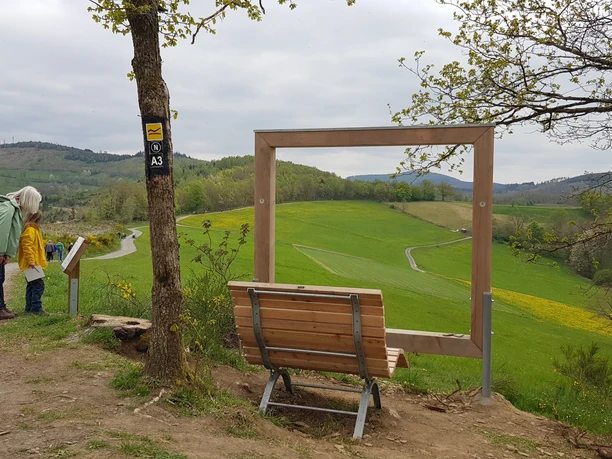 Near the village of Ruckersfeld, the 4.5 km long Erlebnisweg Hilchenbach leads through meadows, fields, and the typical Hauberge of the Siegerland. 15 panels provide information and insights about stories along the way: the forest as a place of relaxation, a resource provider, or a habitat for animals and plants. Many panels also offer small interactive activities such as searching for Hauberg marks on trees, feeling tree bark, or looking through a telescope.