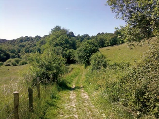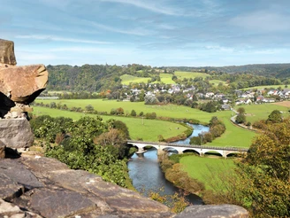 From the Stein hiking car park, you first go over a meadow path up to a mountain ridge with a breathtaking view of the Blankenberg castle complex. A somewhat windy day provides a special experience at the "Sound Throne." A narrow path leads down to fish ponds and the nature reserve "Ahrenbachtal and Adscheider Tal." Under ancient oak trees, you follow a natural creek floodplain. Woodpeckers and robins live here, and in summer dragonflies glide over the water. A meadow path leads to a short asphalt section, which you walk up to the height, where it continues on a field path. On the high meadows and pastures along the way, fruit trees grow and sheep and goats graze. In earlier times, the Burgberg’s vineyards stood here. Through the imposing Katharinentor gate, you reach the town of Blankenberg – today a district of Hennef that has preserved its medieval charm with its half-timbered houses and winding alleys. Past the marketplace, you leave the town again and walk toward the castle ruins. From a viewing point above the steeply sloping hillside, you have a great view over a curve of the Sieg and learn exciting details about the formation of the landscape. Surrounded by walls and hillside meadows with old fruit trees, the path leads back toward the starting point. Let your gaze wander: the Sieg valley shows itself here in its picture-book side. Down steep paths and stairs, you come back to the Stein hiking car park.