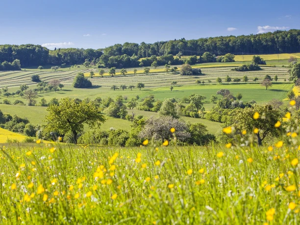 Characteristic of this full-day cycling tour are the typical gently rolling and extensive landscape sections of the Bliesgau Biosphere as well as the scattered shade-giving forests. From the parking lot at the Blieskastel-Lautzkirchen train station, the route marked by Velo-vis-à -vis signage leads over the "Glan-Blies-Radweg" to the heights of Blieskastel-Webenheim. Over paved farm roads you go up to the "Große Höhe" near Dellenhof. The view extends far into Saarland and Rhineland-Palatinate and occasionally a small forest is crossed. Always staying on the forest edge at height, the Vosges are even visible on the horizon. Finally, it goes through the wonderful cultural landscape over Gersheim-Niedergailbach down into the Bliestal. The route continues towards the French neighbors, to Sarreguemines. At the border you immediately come across a turnoff to a Gallo-Roman excavation site. The European Cultural Park Bliesbruck-Reinheim is a cross-border archaeology park showing excavations and reconstructions of both Celtic and Roman finds. In addition to the impressive walkable reconstruction of a princess's grave, several Celtic houses and a Roman estate, the mainly French-side reconstructed baths of the Gallo-Roman site are especially fascinating. Back on the railway track cycle path, the "Glan-Blies-Radweg", you gradually leave the Bliestal and cycle into France up to just before Sarreguemines. The worth-seeing old town of Sarreguemines is worth a visit. In addition to the particularly impressive casino on the Saar riverbank, restaurants and cafés invite you to take a break. If you are already tired, you can take the Saarbahn to Saarbrücken and from there the train back to Blieskastel-Lautzkirchen. But the continuation is worth it: You leave the border town on the French side via a cycle path through the lower Bliestal and come back to Saarland in Bliesmengen-Bolchen in the beautiful Mandelbachtal. A detour to Gräfinthal is a must! The historically shaped architectural ensemble makes Gräfinthal together with its gastronomy one of the most popular excursion destinations in the Bliesgau Biosphere. Then it goes a little back to Bliesmengen-Bolchen and further over a short but quite steep climb into the Bliestal. A picture-book landscape with orchards and fantastic views opens up in front of you until you reach the lookout tower on the "Heidenkopf". Further it goes on forest roads down into the Mandelbachtal to the Cultural Landscape Center Haus Lochfeld. There is a freely accessible organic vineyard, an orchard meadow with herbal garden, wild shrubs and wild rose hedges, a rose, berry, and fruit garden. Over Erfweiler-Ehlingen you get back once more to the heights of Blieskastel-Biesingen and from there over one of the most beautiful descents in Saarland through the "Lange Tal" to Blieskastel-Alschbach and then back to Lautzkirchen station.