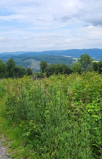 From the main hiking portal in the town center, we follow the road "Auf dem Graben" in the direction of Medebach. A short ascent on an asphalted path takes us to the "Zum Brande" refuge. Here, at the edge of the forest, you have a beautiful view of part of the village and the Waldecker Bergland.
