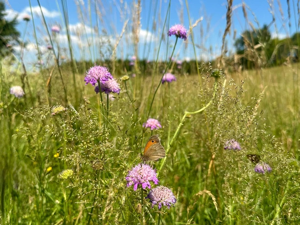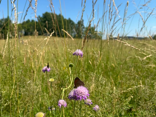 The bloom brilliance of the mountain meadows unfolds especially splendidly from mid-May to the mowing in July. Then at Kreuzberg, cranesbill, bistort, and co. compete with the sun in shining. But even during the hay harvest, the post-bloom, and in Indian summer, the meadow landscape offers much to see well into autumn. The jewel of the Winterberg mountain meadows, the gold-orange shining Dukatenfalter butterfly, can also be observed here. For butterflies, grasshoppers, and many other animals, the flower-rich mountain meadows and pastures are a true paradise.