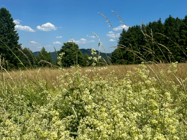 Along the Kreuzberg, you experience a landscape that has become increasingly rare or is even threatened with disappearance due to changes in agriculture – species-rich mountain meadows and pastures. The colorful mountain meadows, called "Goldhaferwiesen," are something very special. In their characteristic composition with all the mountain herbs, they can only be found in North Rhine-Westphalia in the highlands of the Eifel and Sauerland. Together with local farmers and horse owners, the LIFE project “Mountain Meadows near Winterberg” gives them another chance.
