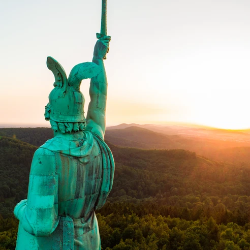 After a short visit to the WALK hiking competence center and the ascent of the Hermann monument with its fantastic views, we start our hike. Passing the bird park in Heiligenkirchen with its exotic birds and small animals, we hike over the Hangstein towards Wiggengrund and climb up to the Große Egge. The European Hiking Cross - where the E1 European Hiking Trail and the R1 European Cycle Route meet - and the Externsteine are further highlights of our hike.