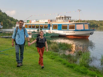 After an exciting boat trip across the Talsperre Pöhl from the dock near the dam wall, the boat stops at the request stop Altensalz. In the picturesque village, with a former salt spring and a 700-year-old church with a gothic wooden ceiling featuring baroque ornamental painting, begins the actual six-kilometer hike along the reservoir shore back to the starting point.