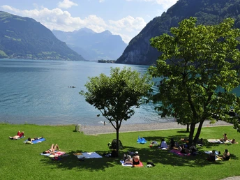 Shortly before Flüelen, the path turns left into the nature reserve at the Reuss delta. Now you have the choice: either follow the path along the lake, or go directly through the nature reserve. Both paths lead you to the Reuss, which you cross via a wooden bridge. Finally, the further path leads you directly to the train, bus, and boat station at Flüelen on the lake.