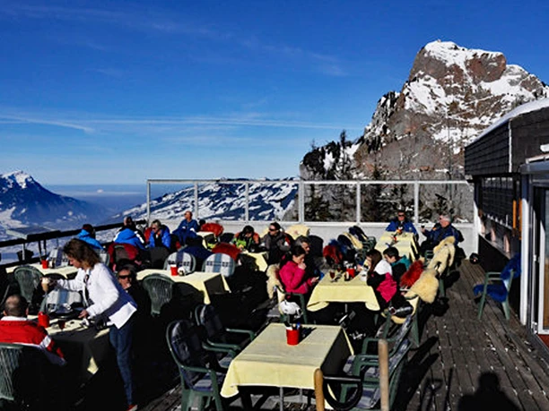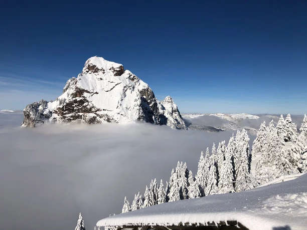 This short but extremely beautiful trail offers marvellous views of the Grosser Mythen, the Muotathal and Lakes Lucerne, Lauerz and Zug and promises a wonderful winter's day. A tip: For extra fun, you can choose to sledge down to Schwyz at the end. You start at the Rotenflue cable car and head towards the Rotenfluh mountain inn, continuing along the perfectly groomed trail past the Alp Rotenfluh kiosk. At the end, the route climbs a little to the Rotenflue mountain station, where you can enjoy a delicious coffee in the Gipfelstubli restaurant.
