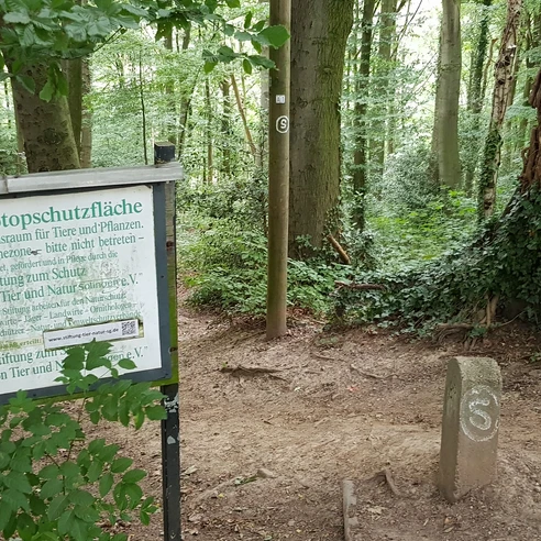 Continue right along the Klingenpfad which turns left onto Widderter Straße shortly after the brick house which is number 94. This leads up to Lacher Straße. Cross straight ahead into Johänntgesbrucher Weg. Head down to where the “S” Klingenpfad branches off to the left into the forest. The path leads downhill before reaching a wide track. Follow it left. Pass the Strupsmühle and keep straight ahead on the beautiful forest path. Ignore first a turn off down to the right and then one up to left.