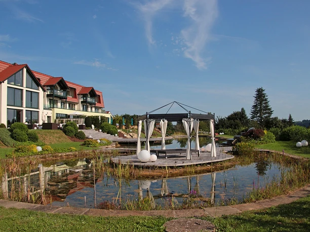Between the shoreline and the lake circular route lies a swampy forest area paved with wooden stepping stones. Shortly thereafter, there is the possibility to rest at the Kneipp facility.