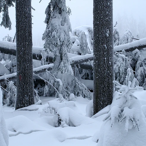 The snowshoe tour of medium difficulty leads through snow-covered forests north of Finsterau. One can experience the forest in all its facets with dense old stocks as well as bark beetle and windthrow areas. The tour continues from the village center of Finsterau towards the renatured bog Finsterauer Filz, on to Alte Klause, the Freilichtmuseum Finsterau (open air museum) and back again.