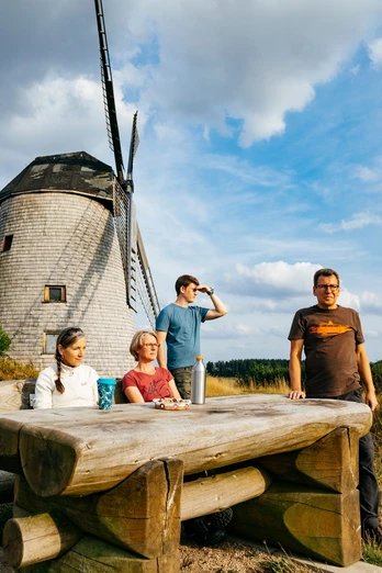 Continuing along the edge of the forest, you finally get a great view of the Bavenhausen windmill, which you reach later on. Once you reach the top of the windmill, a seating area and a landscape lounger invite you to rest and linger and offer a great view over the Lippe highlands.