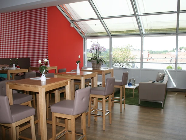 Auf unserer Dachterrasse können Sie sich kulinarisch verwöhnen lassen und den Blick über das traumhafte Schloss Kaltenstein und die malerische Landschaft schweifen lassen.