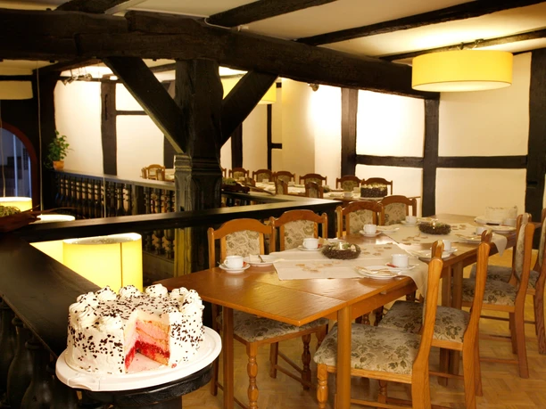 Het ontbijtcafé is verdeeld over twee verdiepingen en wordt gescheiden door vrijstaand vakwerk en historische muren. Geniet van een plakje cake of ontbijt in de romantische binnenplaats als je in de zomer komt.