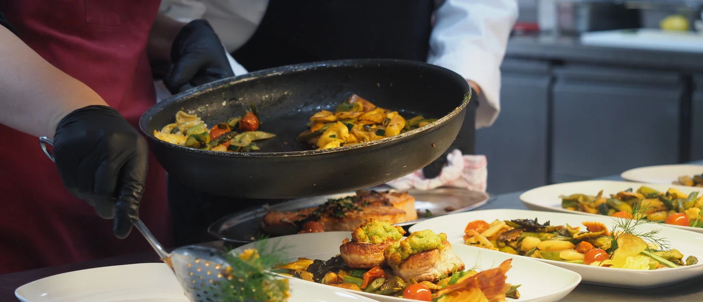 Creatieve en moderne keuken met producten uit de regio, bijvoorbeeld Iburgse beekforel in een laagje pekelham, worst broud met Schrieven of varkenshaas van het land, maar ook bijvoorbeeld een mediterrane pestogroente uit de wok