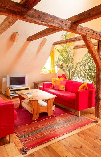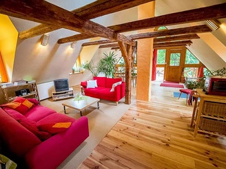 De liefdevol gerestaureerde zolderflat is 80 m² groot en ingericht in warme, uitnodigende kleuren. De volledig beglaasde gevel geeft de hele vakantiewoning een zeer licht en ruimtelijk gevoel.