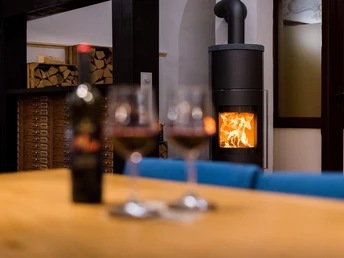 De ruime woon- en loungeruimte met bar, eettafel, grote bank, flatscreentelevisie en zithoek is het centrale ontmoetingspunt. De houtkachel zorgt voor gezellige warmte.