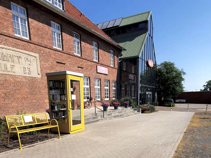 De voormalige landbouwschool (links) en de voormalige huishoudschool (rechts) zijn verbonden door een glazen atrium.