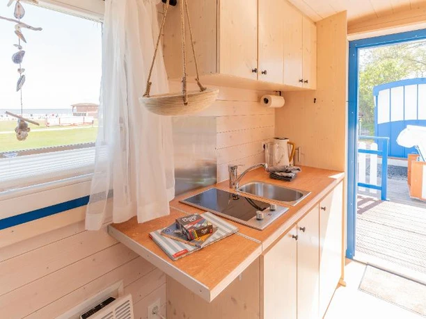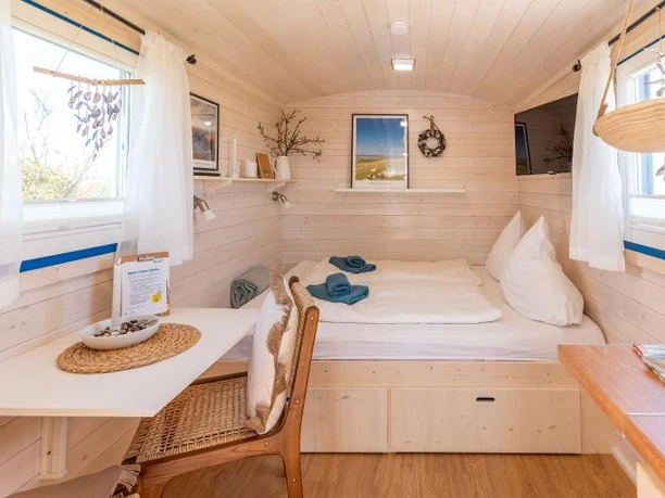 De gezellige Noordzee caravans van massief hout kunnen geboekt worden voor maximaal twee personen en bieden elk een comfortabel tweepersoonsbed (1.60 x 2.00m), een kledingkast en rekken, een kleine kitchenette met fornuis en koelkast incl. vriesvak, twee keramische kookplaten en een magnetron. vriesvak, twee keramische kookplaten, koffiezetapparaat, waterkoker, broodrooster, servies en opbergkast en een eethoek bij het raam. Voor koelere dagen is er natuurlijk een ingebouwde verwarming.