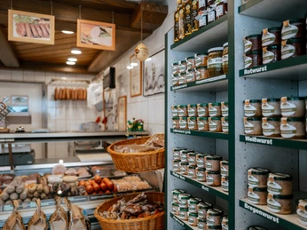 De ambachtelijke boerderijwinkel biedt producten uit de eigen slagerij en van de naastgelegen boerderij.
