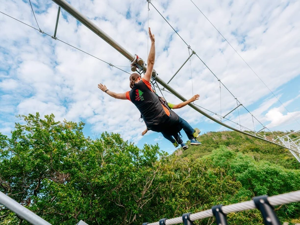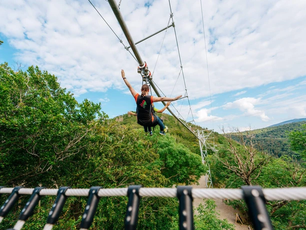 Zwevend door oude eiken en beuken gaat het zigzaggend de kasteelheuvel af. Spectaculaire hoogtes worden afgewisseld met echte natuurbeleving. Het bos ligt binnen handbereik. Langs het boomtoppenpad Harz biedt het zicht op het Kalte Tal, de Nedersaksische staatsbossen en het nationaal park Harz een afwisselende vliegervaring voor jong en oud.
