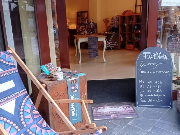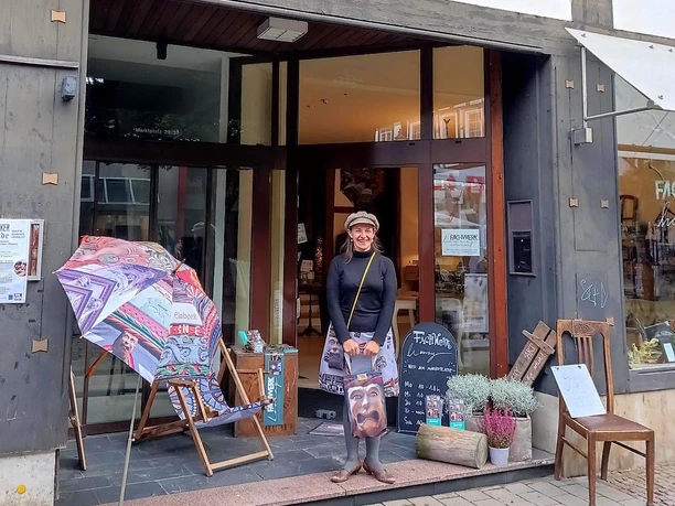 Monumentenactivist en kunstenaarPMK presenteert creatieve en bijzondere vakwerkproducten in haar winkel. Alle artikelen zijn door haarzelf ontworpen, bedrukt of beschilderd en combineren een snufje storytelling met originele cadeau-ideeën. Het assortiment omvat microvezeldoeken, handbedrukte theedoeken, mokken, tassen en nog veel meer. Trouw aan het motto: "Fachwerkkrijgthierbenen".
