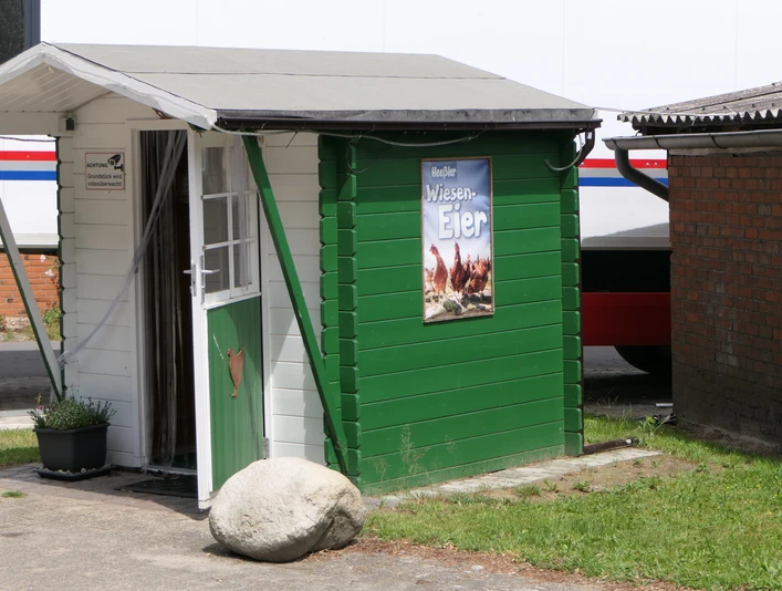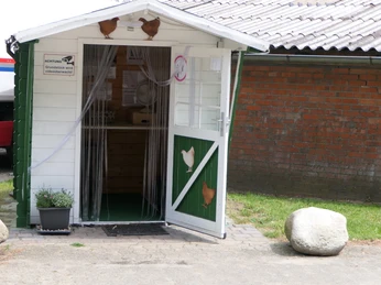 Verse eieren van scharrelkippen worden verkocht in een kleine verkoophut (zelfbedieningskraam). Het aanbod wordt gecompleteerd met pasta van verse weide-eieren, aardappelen, eierlikeur en seizoensgebonden lekkernijen. Kom langs, neem wat kleingeld mee en geniet.